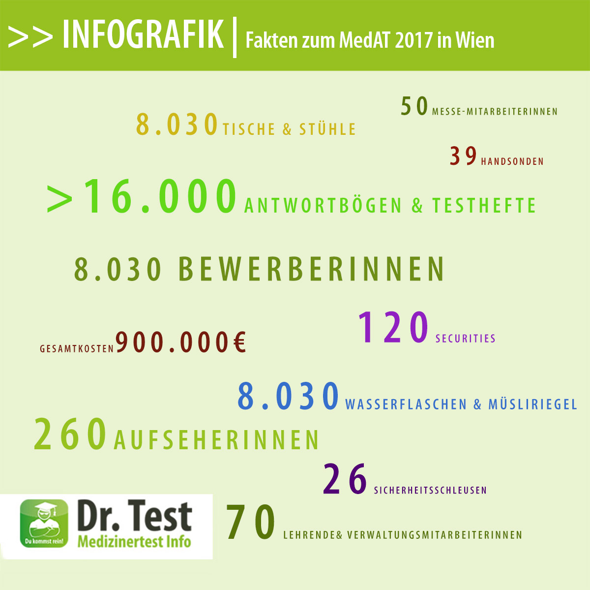 Vergangenen Freitag hat der MedAT seinen 5. Geburtstag gefeiert. So richtig in Partystimmung waren am Morgen des 7.7.2017 allerdings nur wenige der TestteilnehmerInnen in den Wiener Messehallen. Mit über 8.000 Anmeldungen hatten sich in diesem Jahr erneut mehr junge Männer und Frauen beworben als in den Jahren zuvor. Ca. 81 Prozent der BewerberInnen nahmen am Freitag leztlich am MedAT teil. Ein ähnliches Verhältnis zwischen BewerberInnen und TeilnehmerInnen gab es auch an den anderen MedAT-Standorten: In Innsbruck traten 2.811 von 3.672 BewerberInnen zum Test an, in Graz 2.712 von 3.359 und in Linz stellten sich 729 von 932 den Fragen des MedAT. Insgesamt sind 2017 österreichweit 12.760 von 15.993 BewerberInnen zum Medizinertest erschienen.