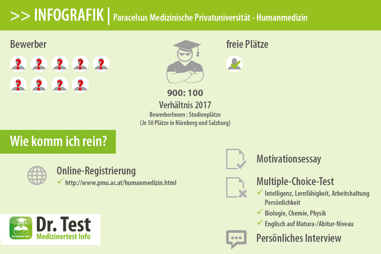 Als Alternative zu den Aufnahmetests MedAT, EMS, TMS oder HAM-Nat der öffentlichen Universitäten, kannst du dich auch an der Paracelsus Medizinischen Privatuniversität (PMU) in Salzburg und Nürnberg für Humanmedizin bewerben.